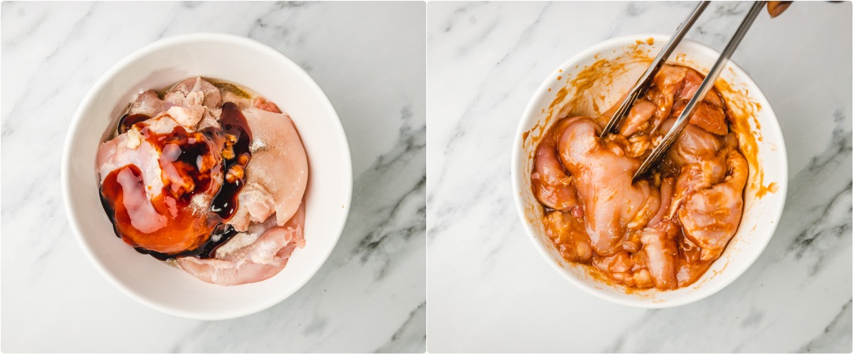 Marinade chicken thighs: remove any unwanted fat from the chicken thighs and transfer it to a bowl or a Ziploc bag.