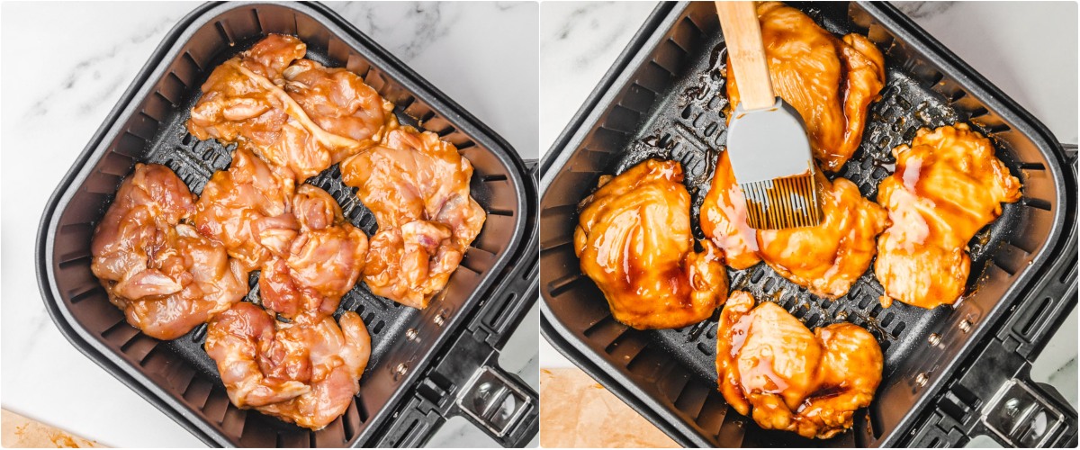 Brush oil in the air fryer basket and carefully add the chicken thighs in the air fryer basket in a single layer spacing them out so they don't overlap.