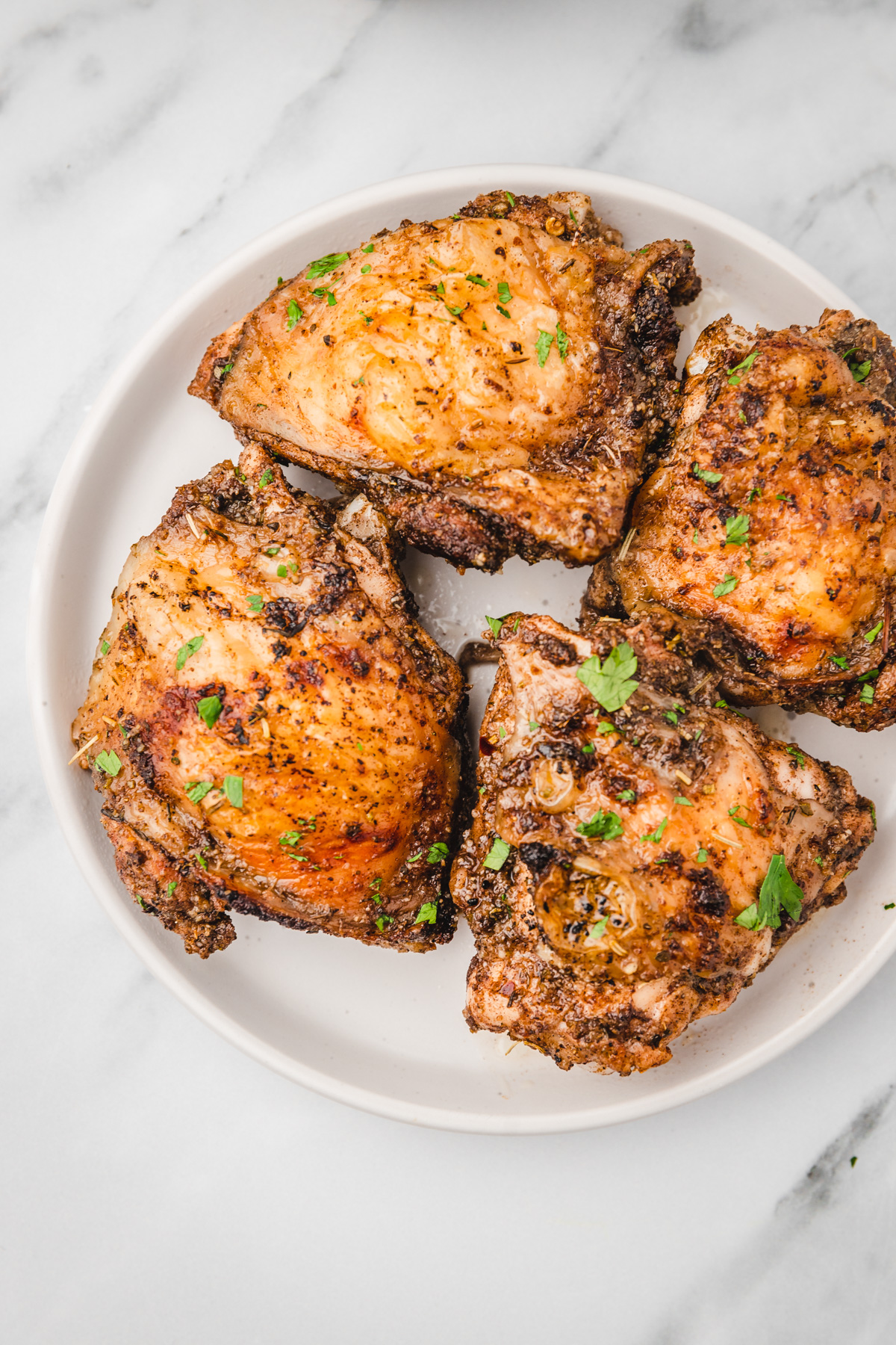 - Flip the chicken thighs halfway through and continue to cook until the skin is crispy or the internal temperature reads 165F / 73C.Serve and enjoy