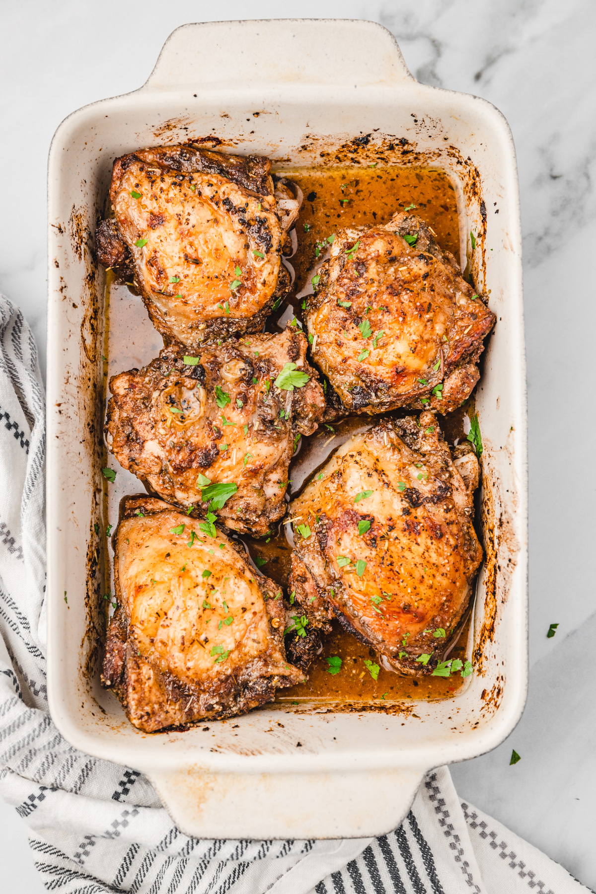 - Transfer the chicken thighs to the prepared baking dish and arrange in a single layer skin side down.