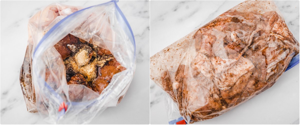 - Prep the chicken: Remove any unwanted fat and excess skin from the chicken thigsh and transfer to a Ziploc bag.