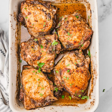 The chicken thighs are baked to perfection in a rich, savory blend of seasonings, creating ultra-tender pieces of moist and delicious chicken.