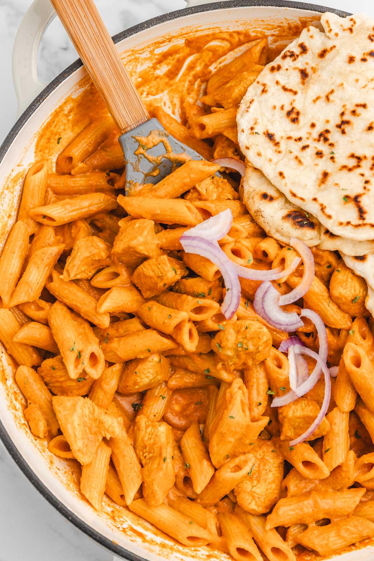 This easy butter chicken pasta is the epitome of comfort food. Homemade creamy, flavorful, and silky butter chicken Indian curry tossed in penne pasta, you wouldn't miss a beat with this one.