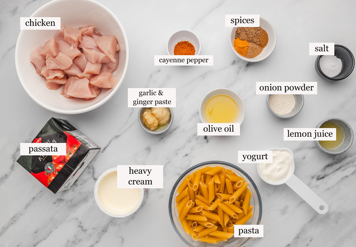 To make this quick and easy butter chicken pasta, you will need the following handful of ingredients.