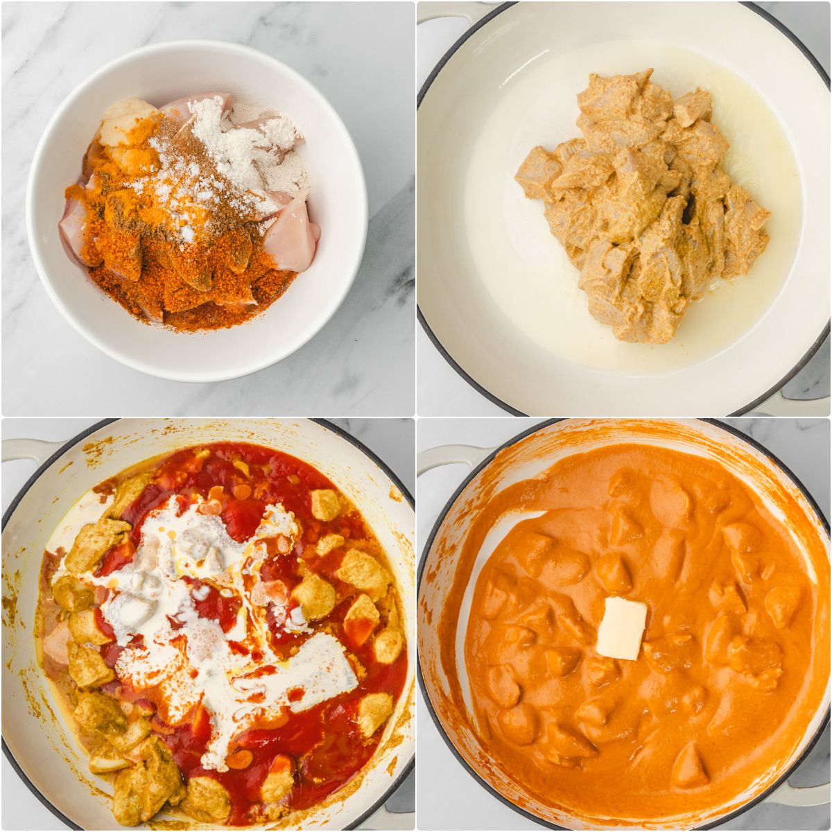 - Season the chicken: in a bowl combine cubed chicken breast, yogurt, lemon juice, garlic paste, ginger paste, turmeric, garam masala, coriander powder, cumin, cayenne pepper, onion powder, salt, and pepper.