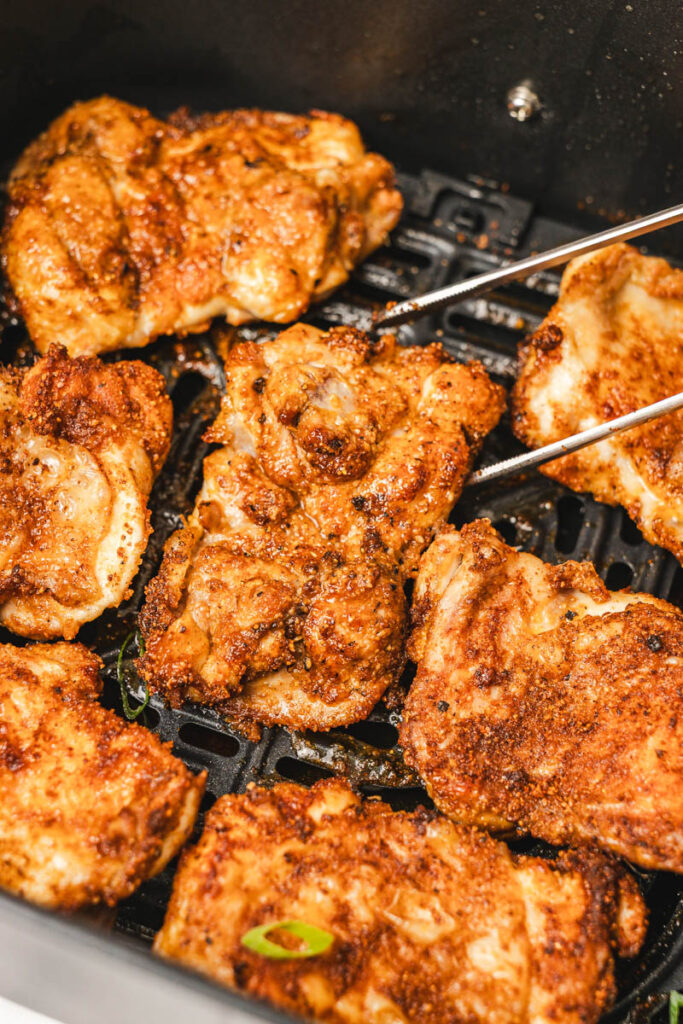 Air fry: Place the chicken thighs in the air fryer basket in a single layer, skin side down and spray them lightly with cooking oil. Air fry for 20-22 minutes, flipping halfway through, or until the internal temperature reaches 165F/74C.