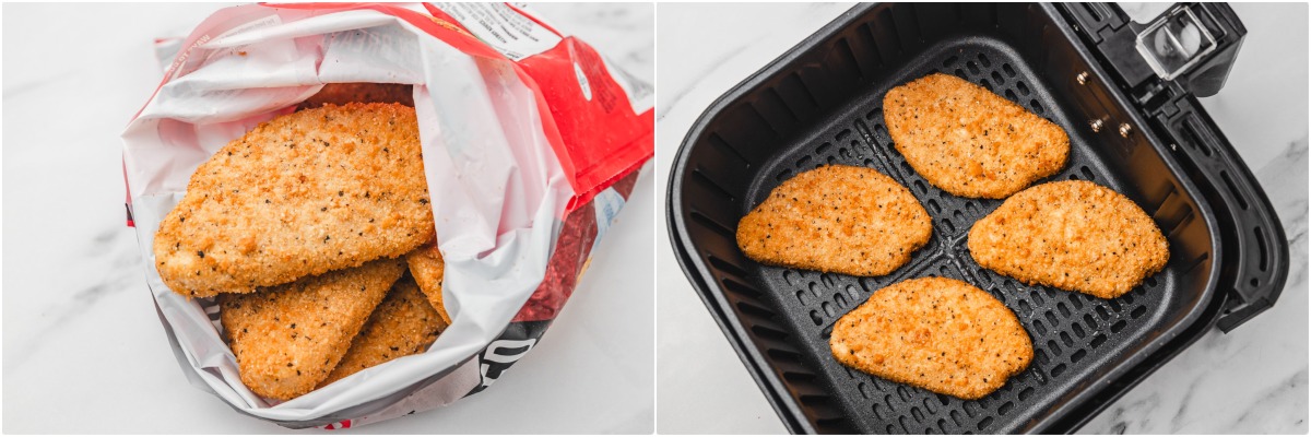 - Remove the frozen breaded chicken from its packaging and arrange it in the air fryer basket in a single layer. Depending on the size, I reckon you would be able to fit about 3-5 in the air fryer basket.