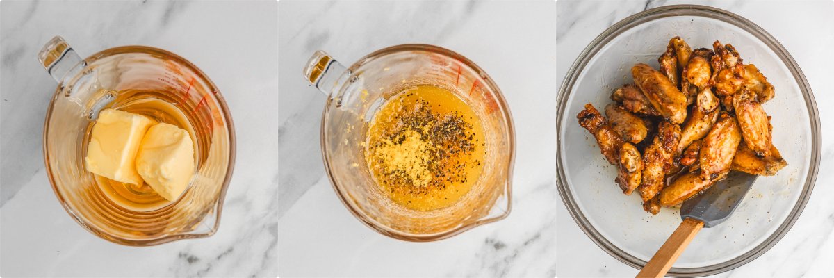 - Make the hot honey lemon pepper glaze: to a microwavable safe bowl, add butter and honey and melt it for 30 seconds.