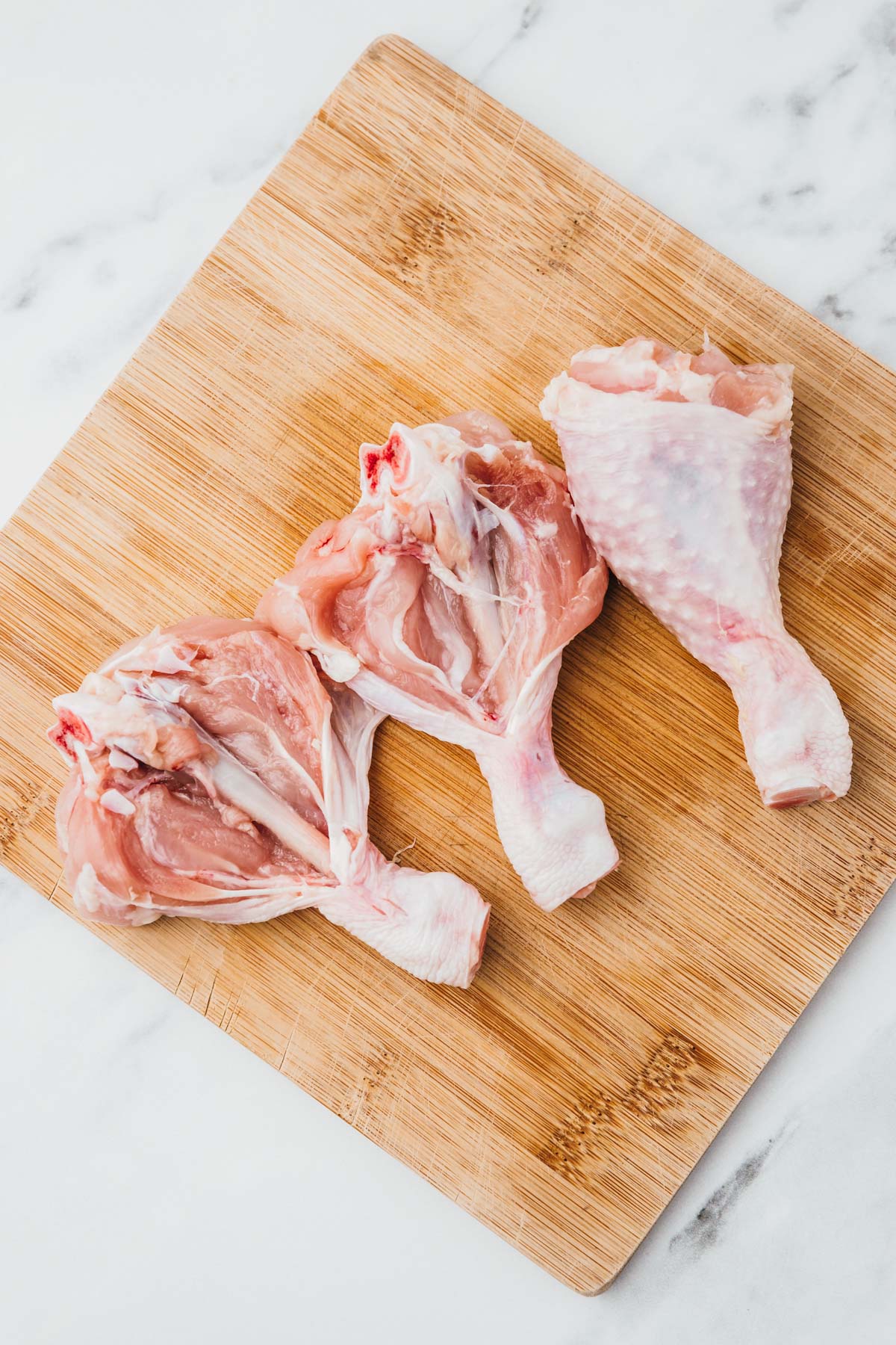 For chicken legs, the meat is separated from the bone and cartilage without cutting the meat all the way through. The bone is still attached to the meat but it can be flattened to form a butterfly.