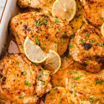 Bake: Arrange the marinated chicken thighs on the lemon slices skin side down and bake for 35-40 minutes. Flip it halfway through until the chicken skin is crispy or the internal temp of the chicken reaches 165F.
